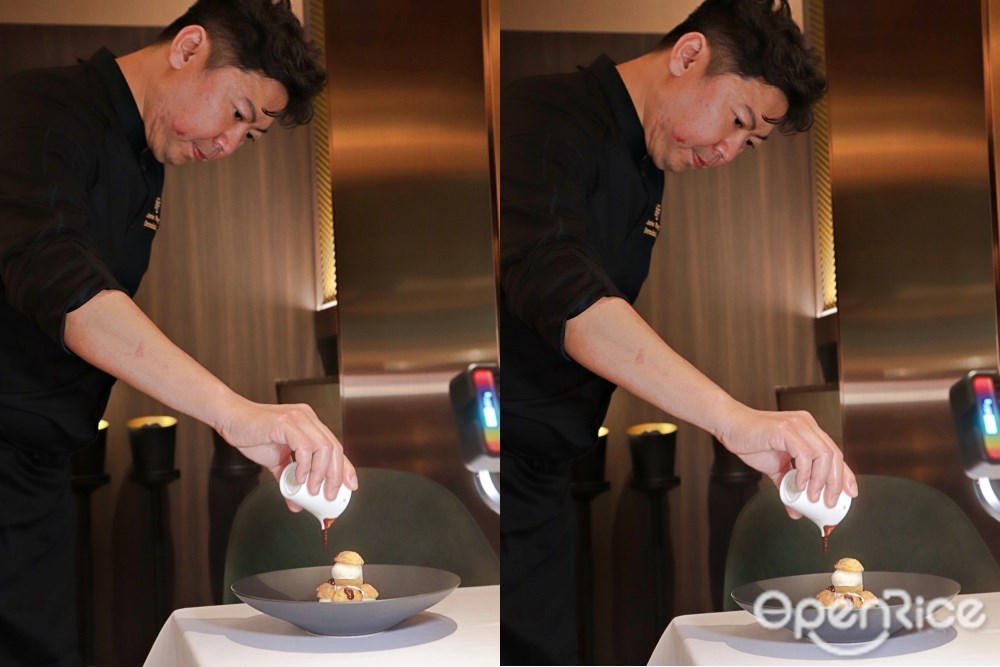 主廚親自演譯招牌甜點「香草冰淇淋泡芙・熱法芙娜巧克力 」還原經典法國甜點「Profiteroles」美味。