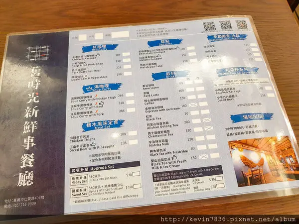 白天結束了搭火車去奮起湖的行程,下山之後便找了一家在火車站附近的餐廳吃晚餐,原先屬意的店家是盛食咖哩,但無奈因為比較晚預約而向隅,改來吃第二選擇舊時光新鮮事。 從火車站步行過來不到5分鐘的距離,外觀看起來是一間很有風格的店家,才知道原來這也是一間老房子呢。店員招呼著入座,並遞上菜單且介紹餐點,主餐分為三大類,分別是咖哩、湯咖哩及定食,咖哩有分兩種咖哩醬,湯咖哩則是比較像鍋物的感覺,雖然很想吃湯咖哩,但因為考量還想吃別的東西所以最後點了咖哩系列 餐應環境在舊時光新鮮事不只可以品嘗餐點,還可以細細觀察老屋建築特色 店內採簡約風,才到用餐時間就滿座,出餐速度也在水準之中 餐點日出漢堡排 $228 這是友人點的,漢堡排相當厚實不膩口 金灑阿里山咖哩雞 $208 這個餐點算是店家的招牌,所以就點來吃吃看,咖哩的白飯是有點像金字塔造型,上面撒了薑黃。至於這個咖哩飯的主角咖哩醬真的濃郁爽口,雖說店員介紹這個咖哩時說會微辣,但我個人是覺得若吃微辣應是還好,旁邊點綴的炸雞口感也相當酥脆且不會過於油膩 旁邊的芝麻是可以磨碎加進咖哩飯增添風味,另餐點附的味噌湯我很喜歡 神木鮮奶茶這個奶茶算是深得我心,因為不會太甜口感又濃郁 紅茶 黑嚕嚕獨立山(巧克力熔岩蛋糕)外觀造型超可愛的,切開之後真的超有熔岩感,巧克力很濃郁但這款甜點略甜比較適合螞蟻人 店家推出在GOOGLE評論贈送小點心,炸物很好吃讓我差點想再點一份 整體心得這次品嚐舊時光咖哩覺得有種物超所值,店家將嘉義元素融合咖哩飯呈現,讓我覺得有種來嘉義才能吃到的獨特美味,而且位置離火車站又不遠,適合沒有交通工具也能品嘗在地美味的旅人…查看更多