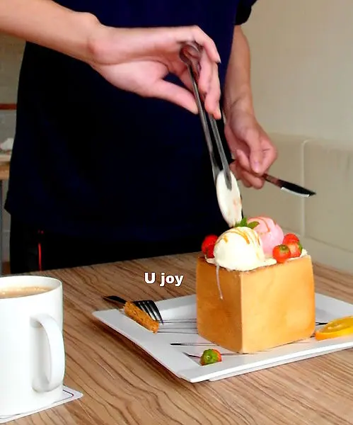 只見店員超熟練的降闢糖土司從藝術品回歸為食材,但是依舊看起來超好吃!!