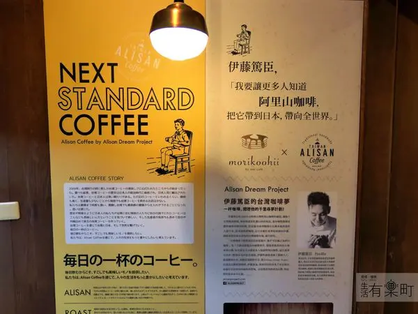店名Morikoohii是日文的Mori(森林)之意,而加上Koohii(咖啡)即成了森咖啡Morikoohii。由熱愛阿里山咖啡的日本人伊藤篤臣推廣進而創立品牌,希望將阿里山咖啡的品牌推向國際。森咖啡的招牌就是伊藤篤臣烘焙的阿里山咖啡,以純熟的日式手沖方式,讓咖啡味香醇飄揚。入內一進門的牆面就有介紹,大家有興趣可以看看森咖啡的誕生歷程。