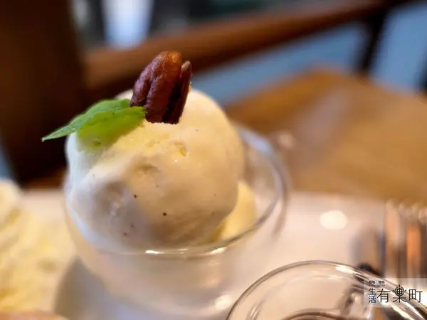 還有這一球香濃的香草冰淇淋也好好吃,淡淡的香草氣息聞起來好香甜,搭配熱呼呼的鬆餅一起入口超美味。