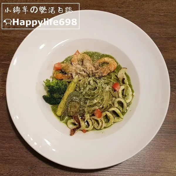 青醬香氣撲鼻,不過小綿羊覺得起司粉灑得有點多,吃起來少了些爽口感,甚至吃完一整盤會有點膩口QQ