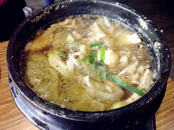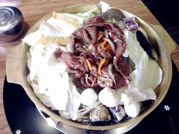 銅盤烤肉(牛) $200來韓式餐館就該點了銅盤烤肉或是鐵板烤肉由於天氣冷的關係~點銅盤可以當作火烤兩吃的火鍋湯頭因為加了蔬菜及海鮮一起煮~多了鮮甜味(不夠可以加湯)