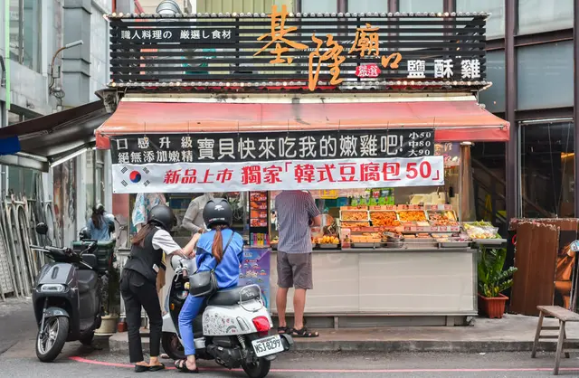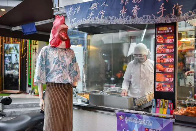 嘉義基隆廟口鹹酥雞的外觀比傳統鹹酥雞店還要有個人特色,門口擺放了一隻雞頭的模特兒,路過都會忍不住多看一眼XD