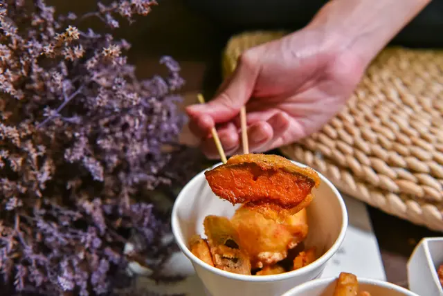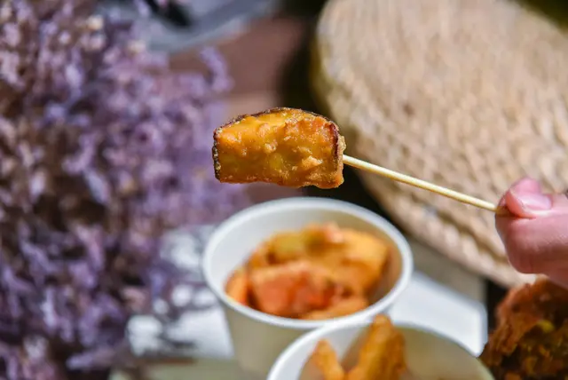 左邊是芙蓉豆腐,芙蓉豆腐熱熱吃則是外脆內嫩,淋上不搶味的日式醬汁也是大家最愛的品項;右邊的炸香蕉因為香氣太濃郁了,會讓其他食物沾上香蕉的味道所以自己額外裝盒?軟而不爛的口感撒上梅子粉很搭耶,香蕉也是每日限量唷!