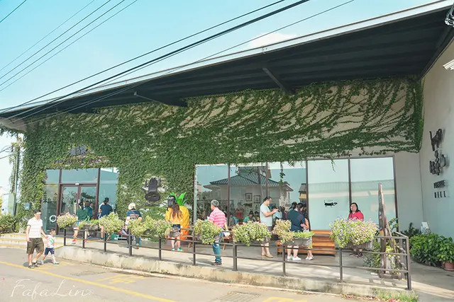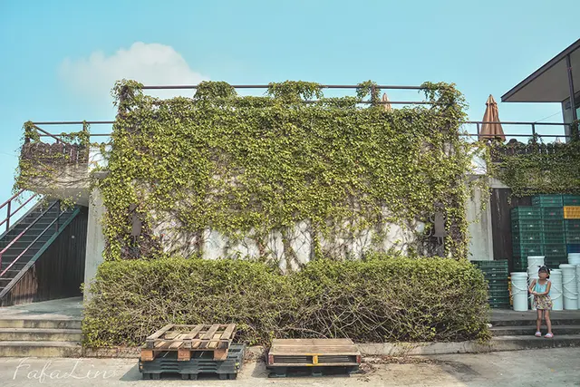 照著導航開進來,沿路都是茂盛的鳳梨田,才看到主建物沒多久,旁邊就是停車場,相當方便。攀緣植物近乎覆蓋整面牆,有種自然風。
