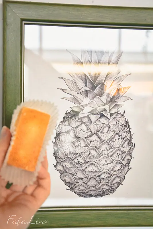 眾多牆面裝飾品中,最欣賞的就是這顆鳳梨素描,於是拿著一半手掌大的鳳梨酥一併入鏡。