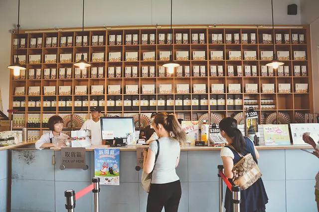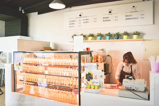 碩大的空間有3分之2都是長桌長椅供遊客使用,最後面則是結帳取貨櫃台,主要品項有10入鳳梨酥禮盒及15入鳳梨酥禮盒,其它的鳳梨酒、鳳梨醋、100%鳳梨汁..等等也蠻受歡迎。