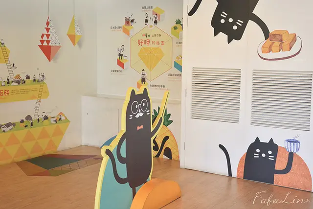 接著來到二樓,牆面上有許多圖標圖案以及吉祥物旺萊貓做為導覽,供遊客了解鳳梨成長及鳳梨酥的製作過程。