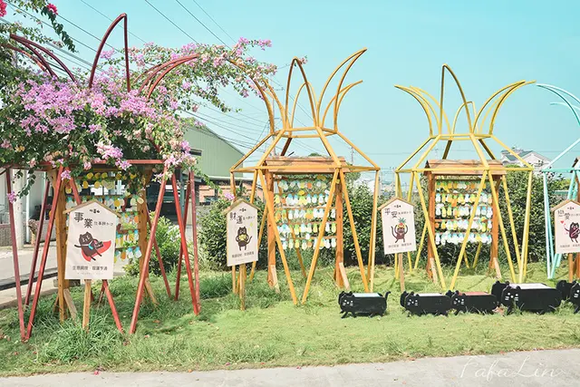 另一邊小廣場通往廁所,這邊有些祈福小牌子。草地上的旺萊貓小椅子一個接一個還蠻可愛。