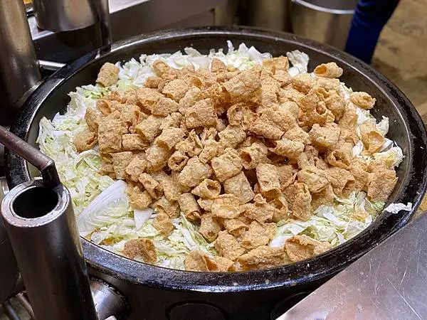 再加入大量的白菜、豆皮、傳統豆腐、黑木耳、金針菇、豬肉(三層肉)、辣椒、蔥……等配料,