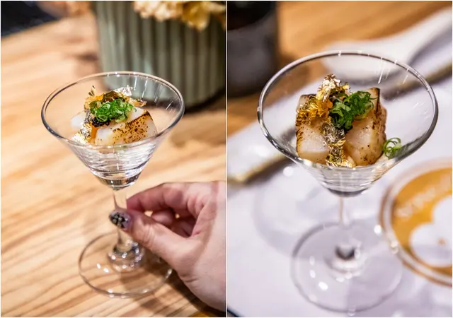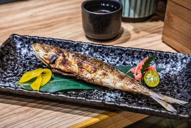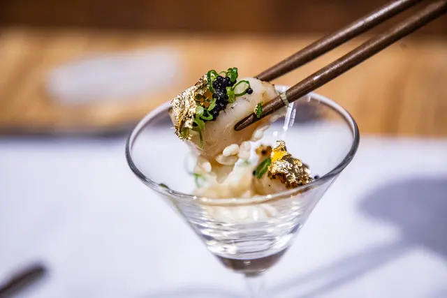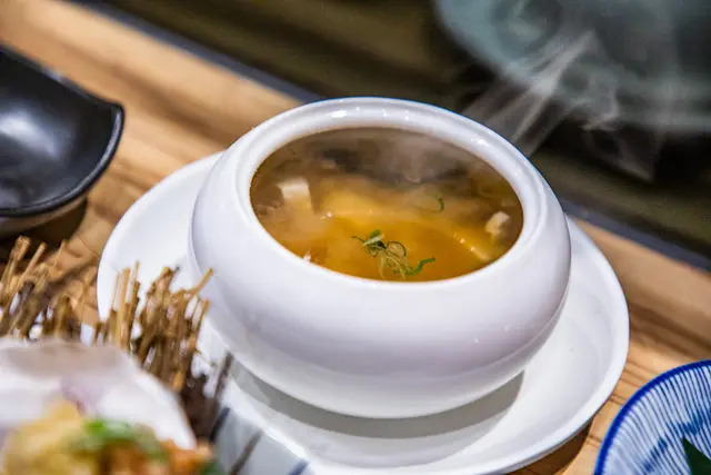 如果您是第一次造訪松匠板前料理,我強烈推薦直上松匠秋楓極上板前獻立!主廚會根據每個季節製作符合時令美味的料理,第一道就讓人驚豔萬分!生鮮干貝原燒搭魚子醬,雙重海味的完美結合,稍稍炙燒過的干貝入口鮮嫩爆汁,加上鹹鮮魚子醬,干貝甜到一個不行!上面還綴上金箔,奢華!