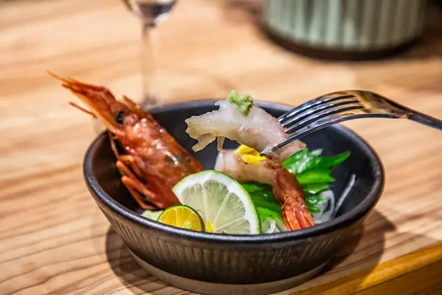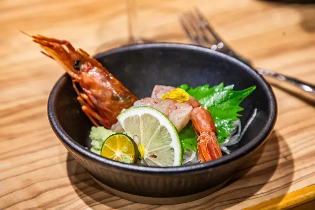天使大甘蝦,生食級的天使紅蝦加上阿里山山葵,天使大甘蝦肉質超級鮮嫩,甜度應該是目前吃過數一數二的高,阿里山山葵也非常厲害,嗆辣感十足還帶甜度,可以更加提升海鮮的美味度!