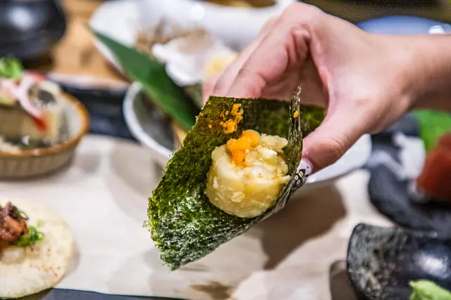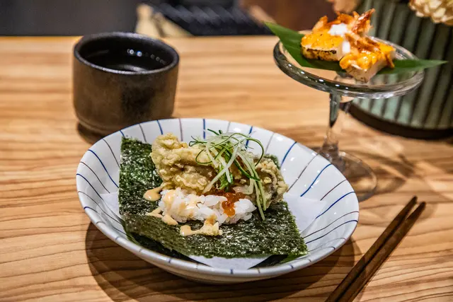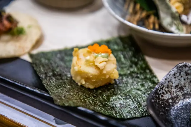 干貝輕揚磯邊燒,水嫩的干貝裹上薄粉油炸,將鮮味及水份封住,用烤過的海苔包裹,海潮香味在口中堆疊釋放,好吃