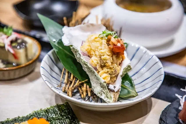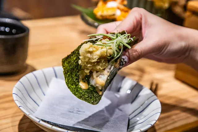 廣島牡蠣太卷,廣島生蠔上薄薄麵衣油炸,放上烤過的海苔及鮭魚卵,吃的時候用海苔將配料捲起來吃,烤過的海苔脆香,加上入口爆漿充滿豐富海味的廣島牡蠣,超級滿足!