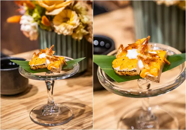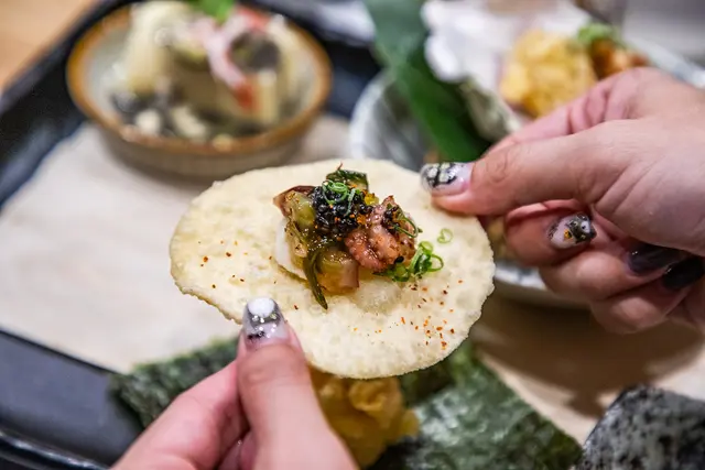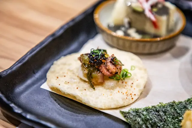 日本芥末章魚搭魚子醬,特製的芥末章魚放上爽脆的脆餅上,加上鹹鮮的魚子醬,Q中帶脆,芥末刺激的辛辣感更能誘發食慾!