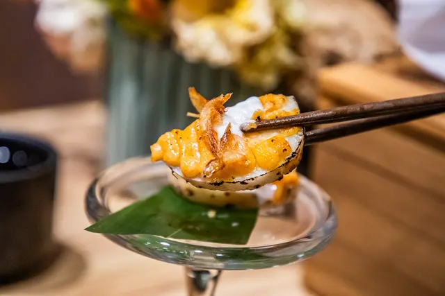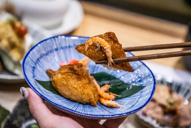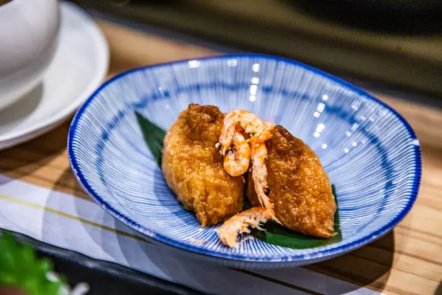 黃金稻禾壽司佐南極蝦,當稻禾壽司搭配南極蝦時,結合了豆皮多汁甜香和清甜蝦肉的鮮味