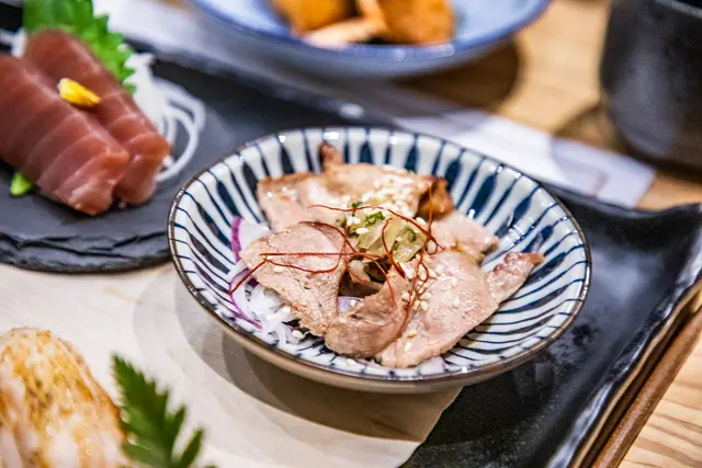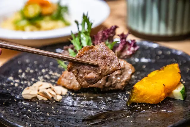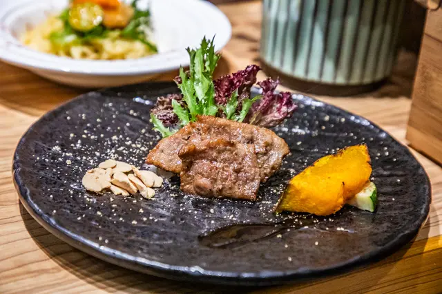 盤克夏黑豚壽喜醬燒,盤克夏黑豚是一種肉質優良的豬品種,其肉質細緻,口感多汁,並帶有豐富的風味,當其與壽喜醬燒結合,那種嫩滑的口感會被醬料中的甜味和鹹味更加強凸現呢
