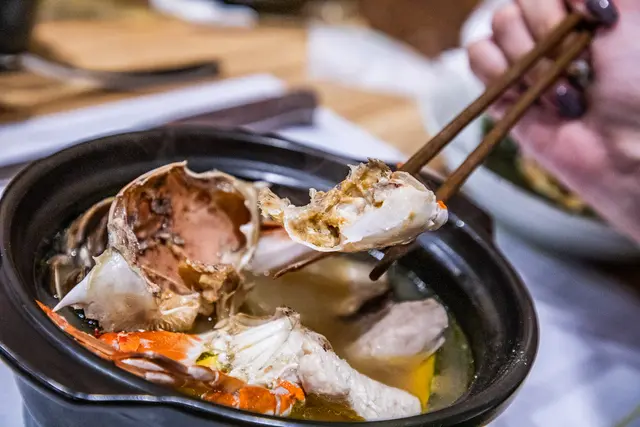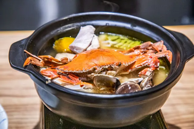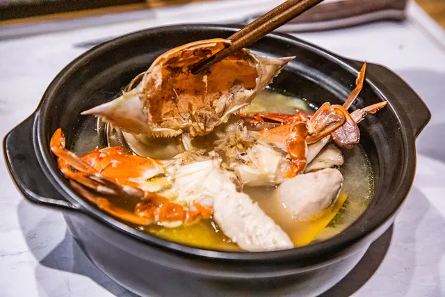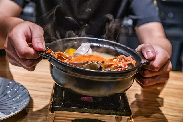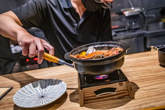 秋蟹石狩味增鍋,石狩味增鍋是北海道的鄉土料理,主廚特別結合現在正當季的三點蟹烹調,以小陶鍋單鍋燉煮,將秋蟹及各種當季蔬菜的美味融入湯中