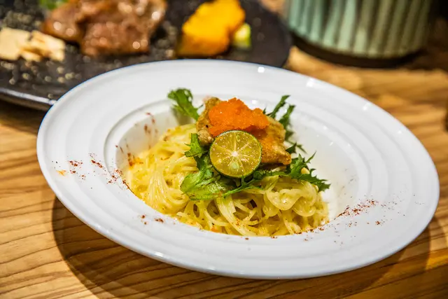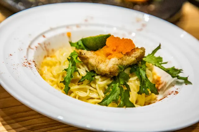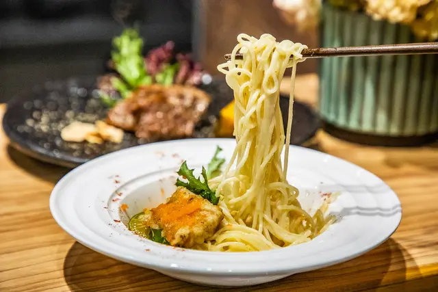 魚菲力唐揚、天使細麵佐奶油白醬,原來剛剛主廚是在料理這道,雖然跳脫傳統日本料理的烹飪手法,畫風一轉變成時尚的和洋料理,天使細麵很容易吸附醬汁,奶油白醬濃郁但不膩,入口滑順入味,好好吃啊,根本可以獨立一個單品來賣了
