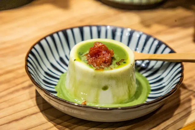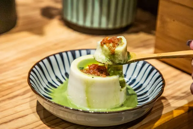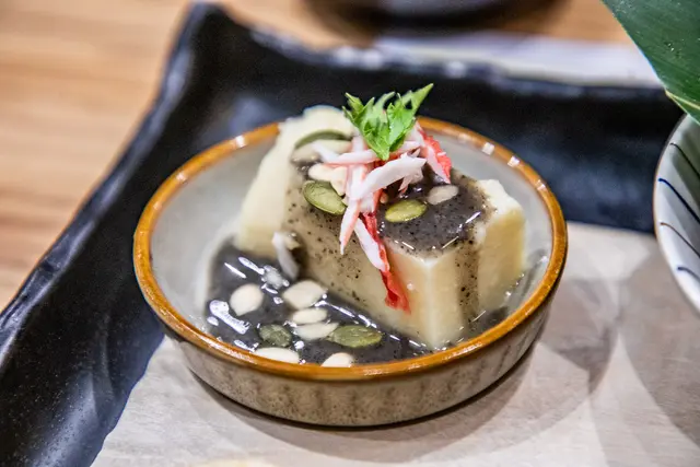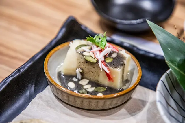 日本蟹肉搭手作冷奴,冷奴,其實是冷豆腐,蟹肉絲搭配冷奴,那豆腐的口感特別細膩,仿佛由綿綿的碎豆腐拼湊而成,每一口都散發出淡淡的香氣,底部的芝麻醬更是點睛之筆,給了整道菜一種獨特的層次感