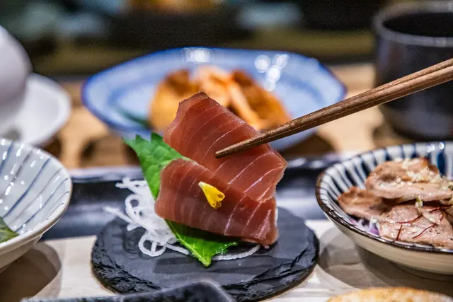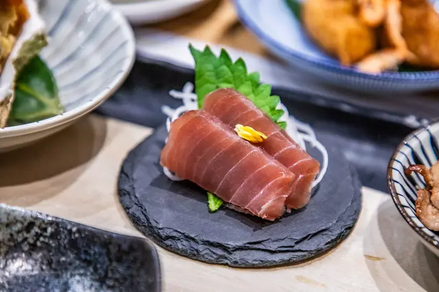 東港黃鰭鮪魚赤身,是用紅肉的部位,肉澤鮮紅含脂量少,口感軟中帶Q,加上一點嘉義特產阿里山山葵,微微辛辣感更帶出鮪魚的甜