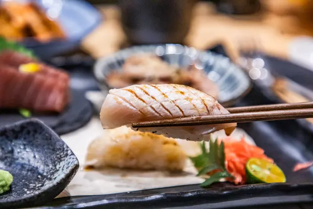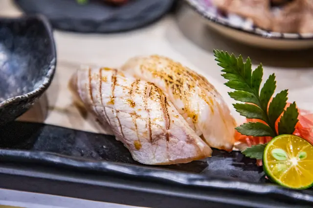 熟成日本真鱸魚握壽司, 經過熟成後肉質更加柔軟沒有筋感,微微炙燒增加鱸魚的鮮甜感,幾乎是入口即化!旬季魚獲握壽司今天是搭配旗魚,有嚼勁,味道又很鮮甜