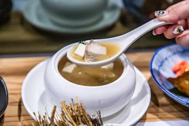 鮮魚關西味增湯,使用時令鮮魚下去與味增一起熬煮,湯鮮腴嫩