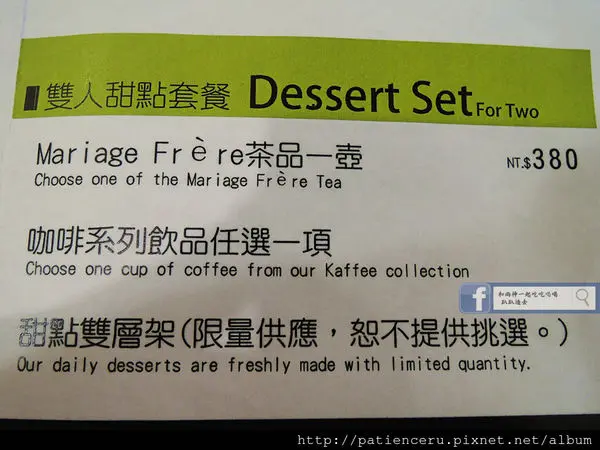 我們點了雙人甜點套餐$380,附茶品1壺咖啡一杯