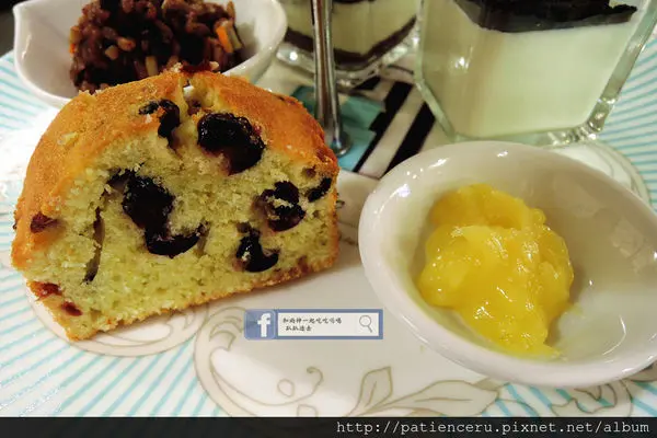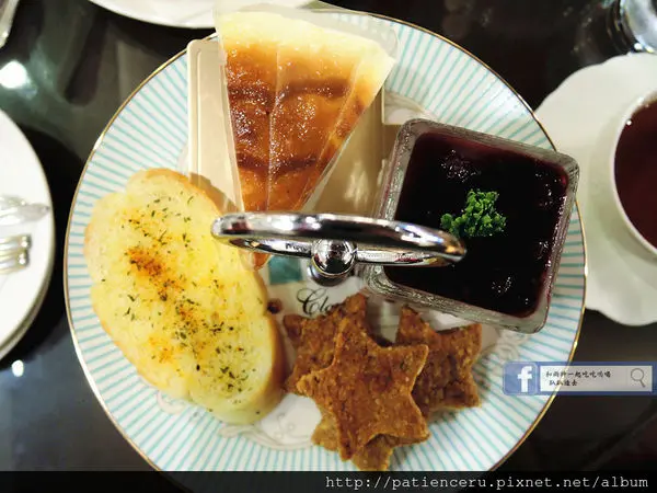 上層有紐約種乳酪蛋糕綜合手工餅乾藍莓慕斯香蒜法國麵包切片