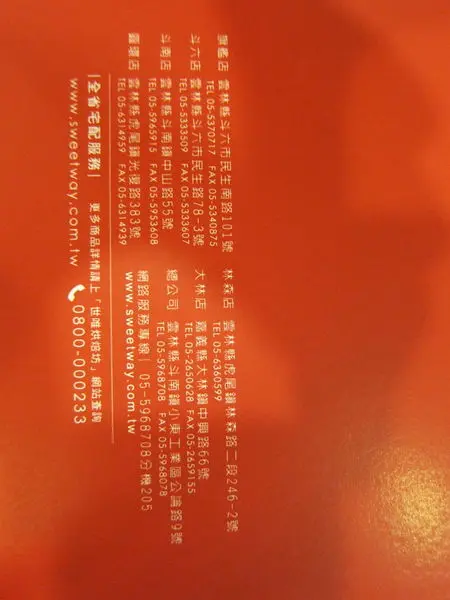 盒背有清楚的標示世唯烘焙坊每個分店,以及訂購的電話跟方式
