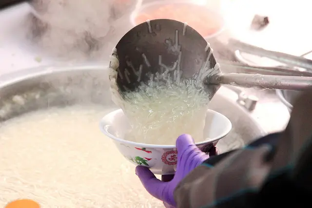 是手工製的白麵線,較一般麵線再粗一些些,只見老闆娘俐落的將熱呼呼麵線裝進碗裡