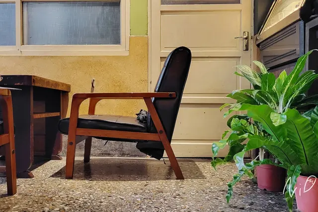 但搭配的桌椅則是簡樸的木質桌,有種新舊風格共處一室的特色