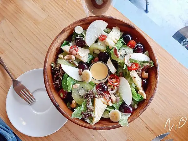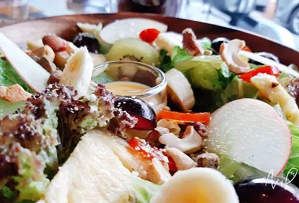 姐姐大人點的沙拉,有許多生菜、水果,以及堅果與點綴的帕馬森起司粉