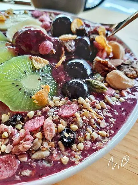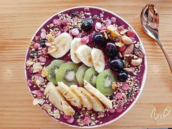 藍紫色的巴西莓果冰沙上面灑滿歲堅果與麥片