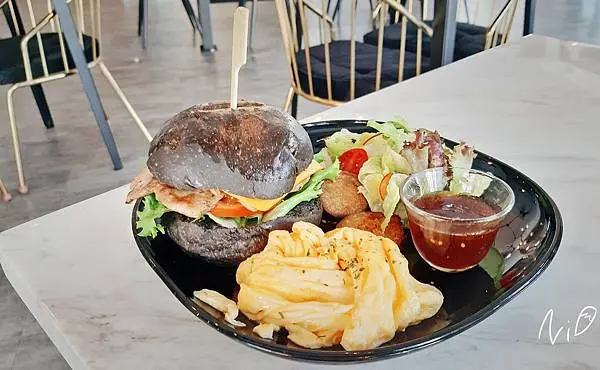 內容包含:漢堡、生菜沙拉、油醋醬、栗子地瓜、薯條(可更換為鮮奶蛋)