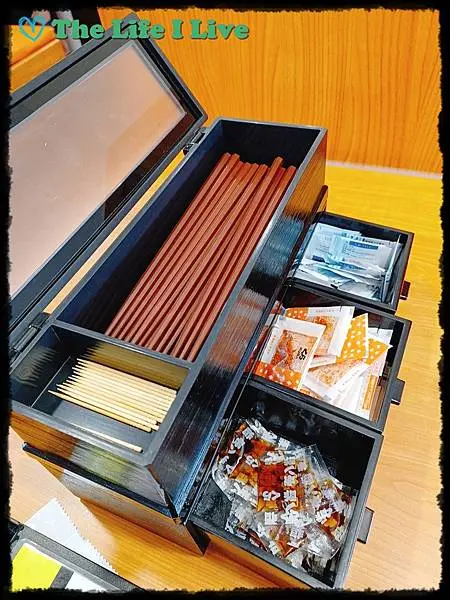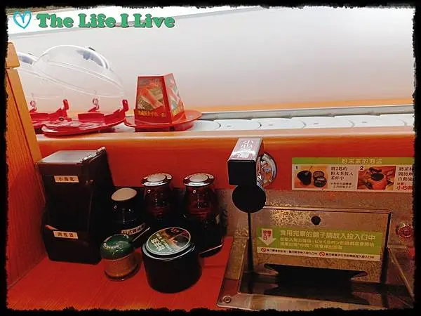 牆面有抹茶粉、生山葵、醬油、小湯匙、開瓶器、熱水,
