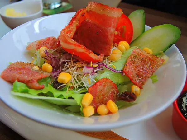 沙拉新鮮翠綠、培根 則是煎的 外皮焦脆、肉質卻又 香嫩。